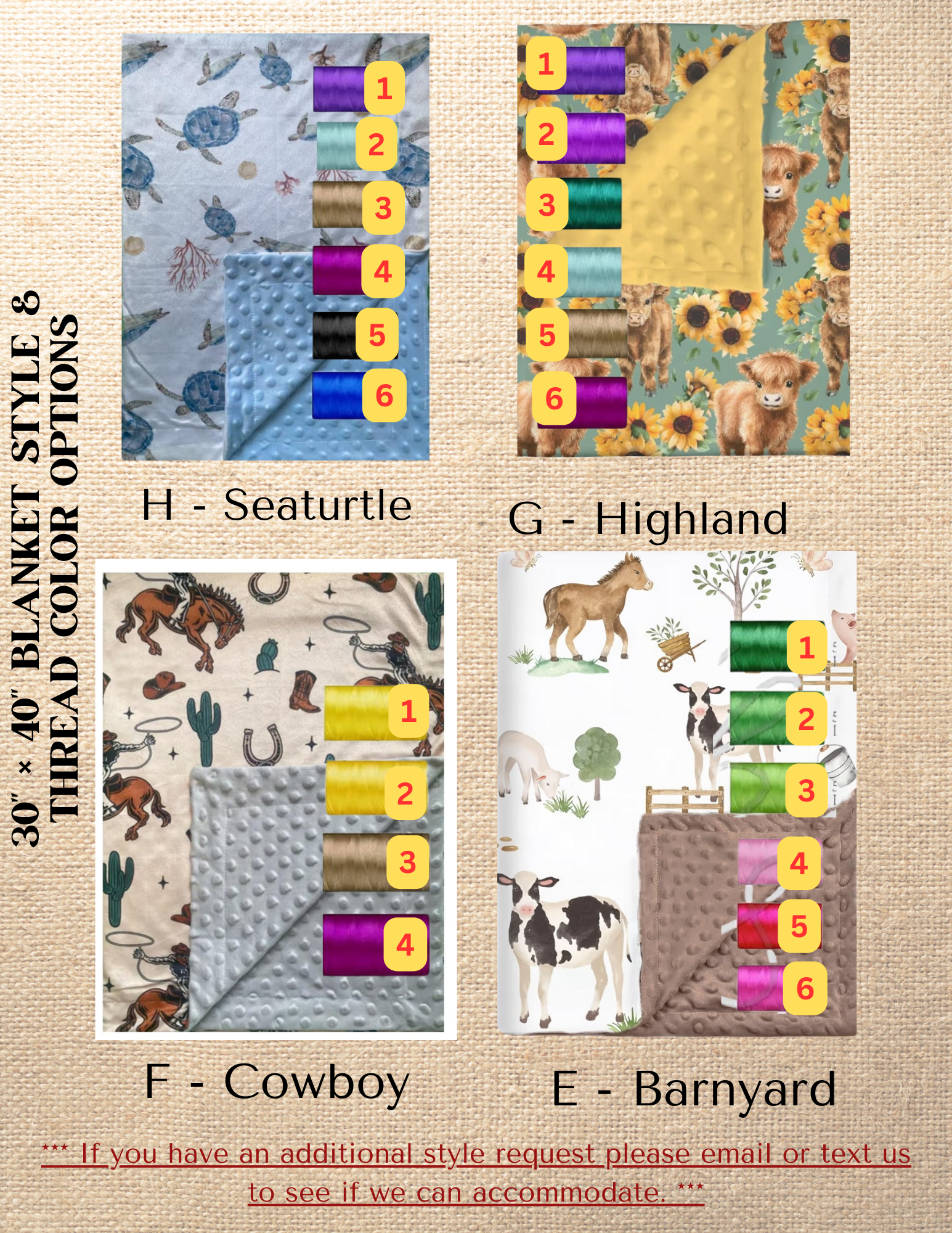 TO ENSURE CLARITY, EMBROIDERY IS RECOMMENDED ON THE SOLID COLORED MINKY DOT FABRIC SIDE. IF CUSTOMER CHOOSES, IT CAN BE DONE ON THE DESIGN FABRIC SIDE.